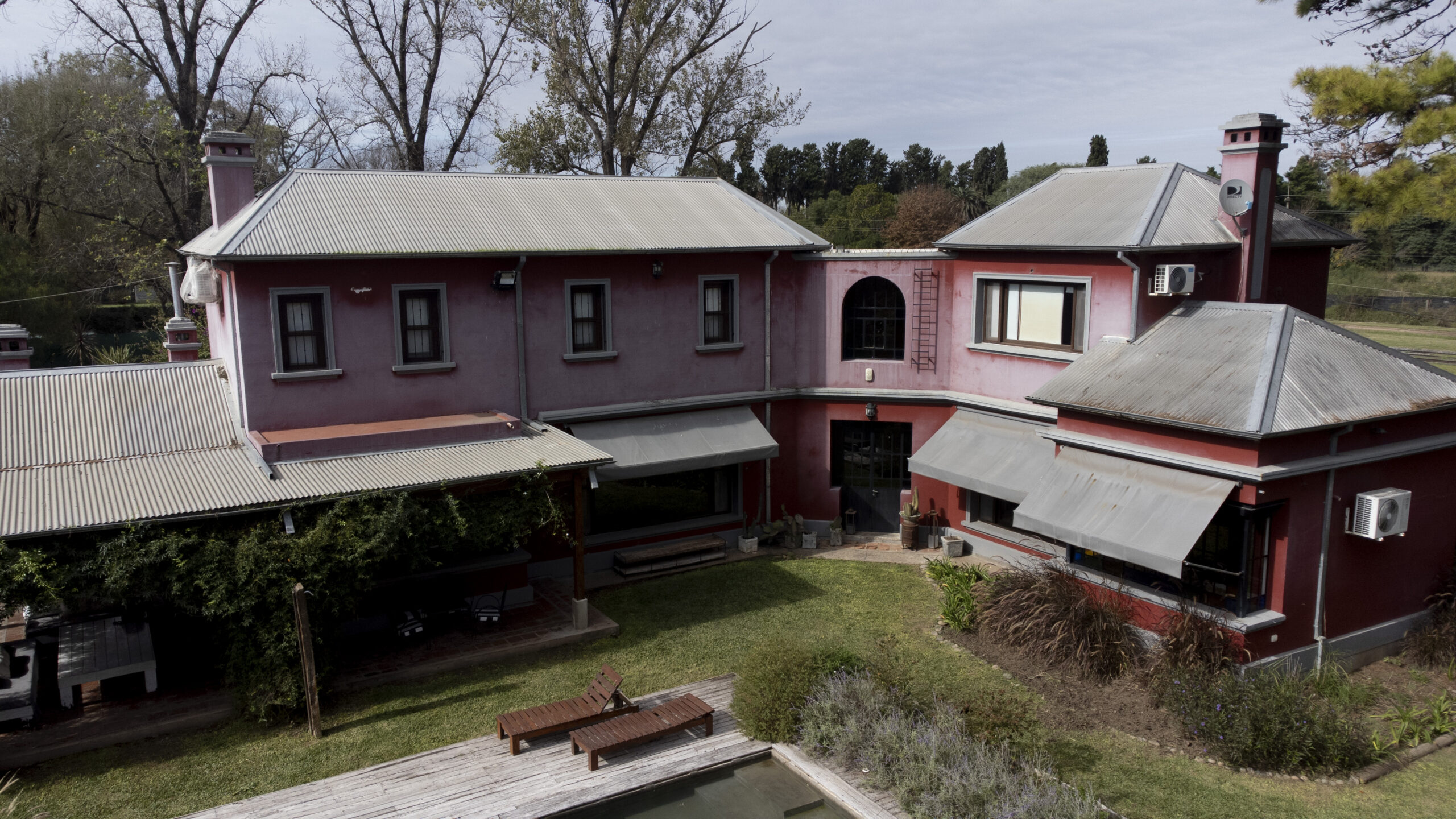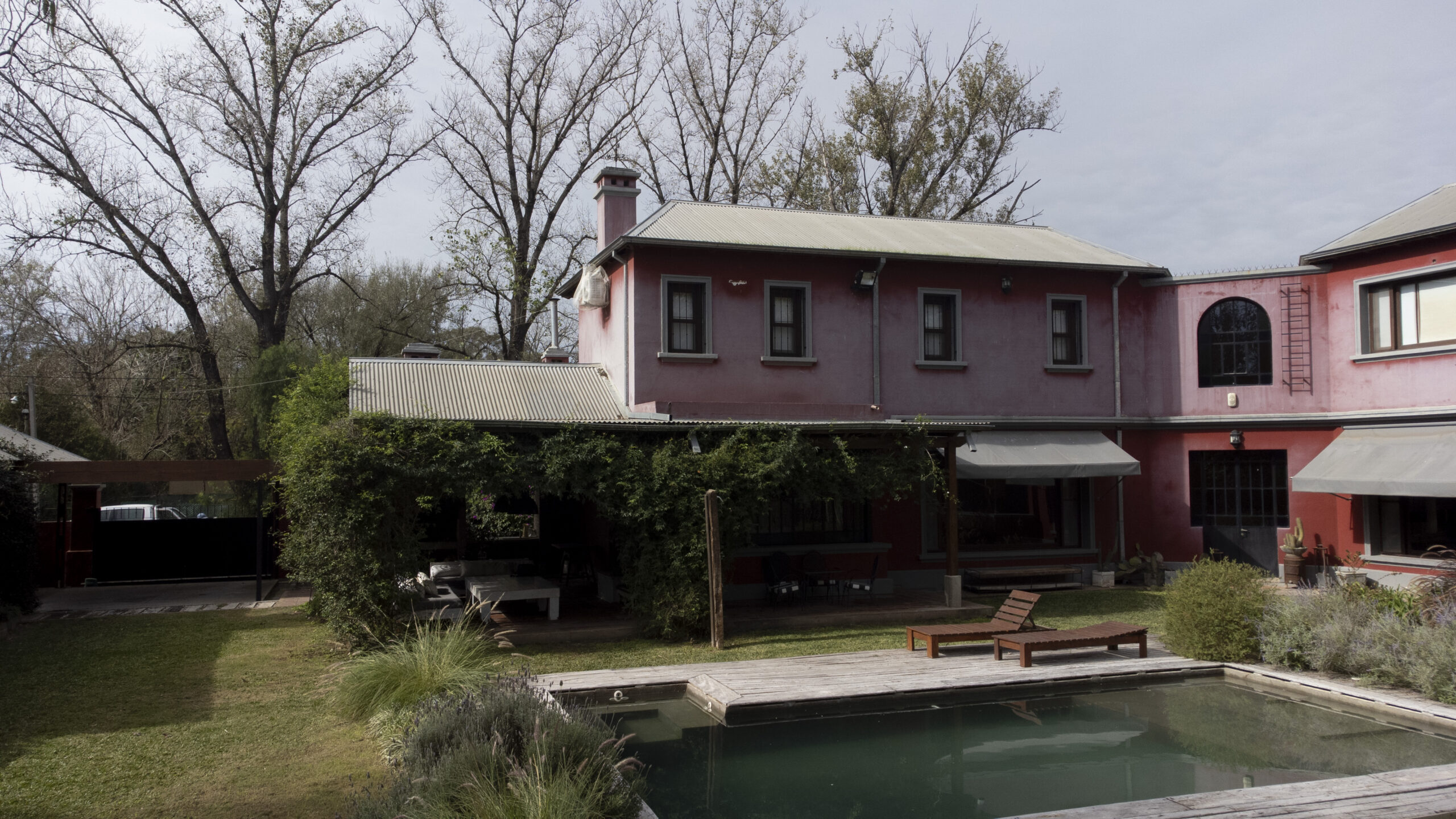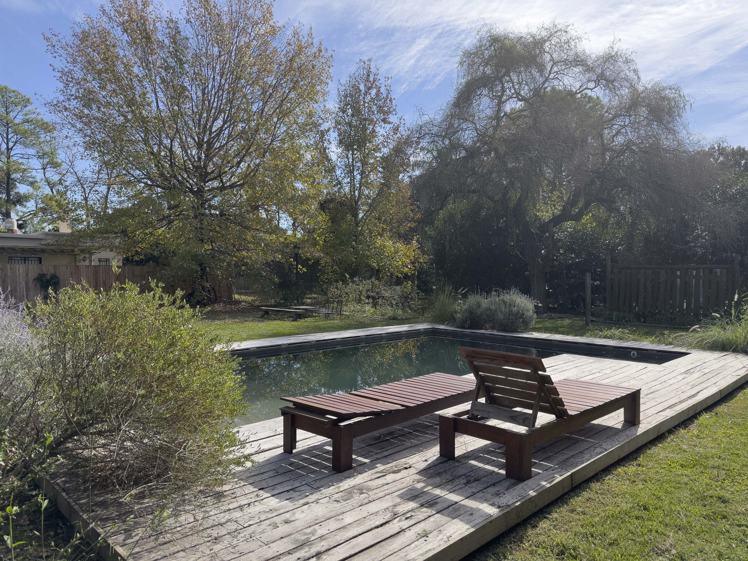 Gran jardín parquizado con piscina y árboles añejos .