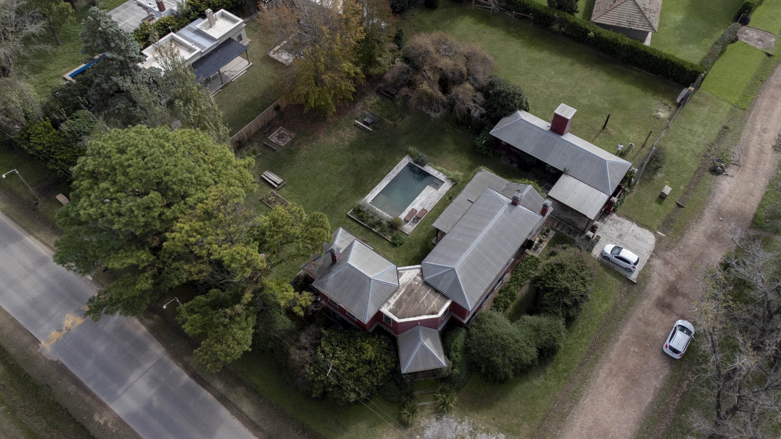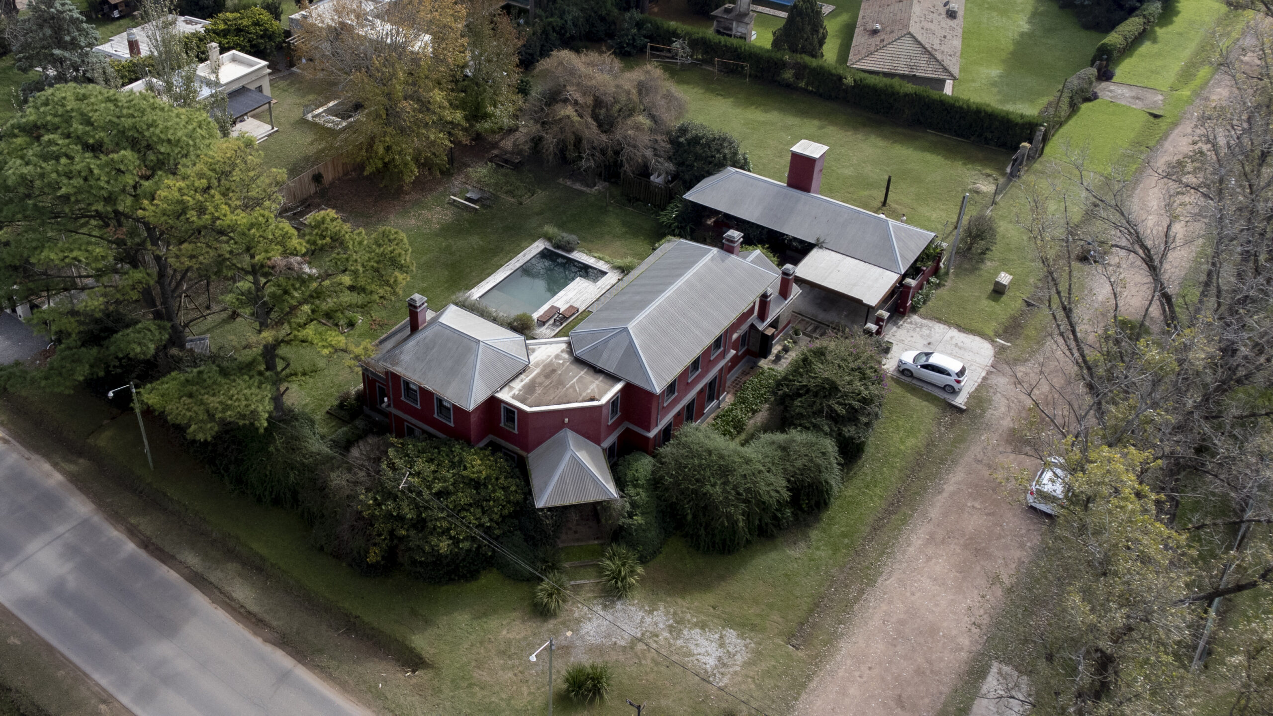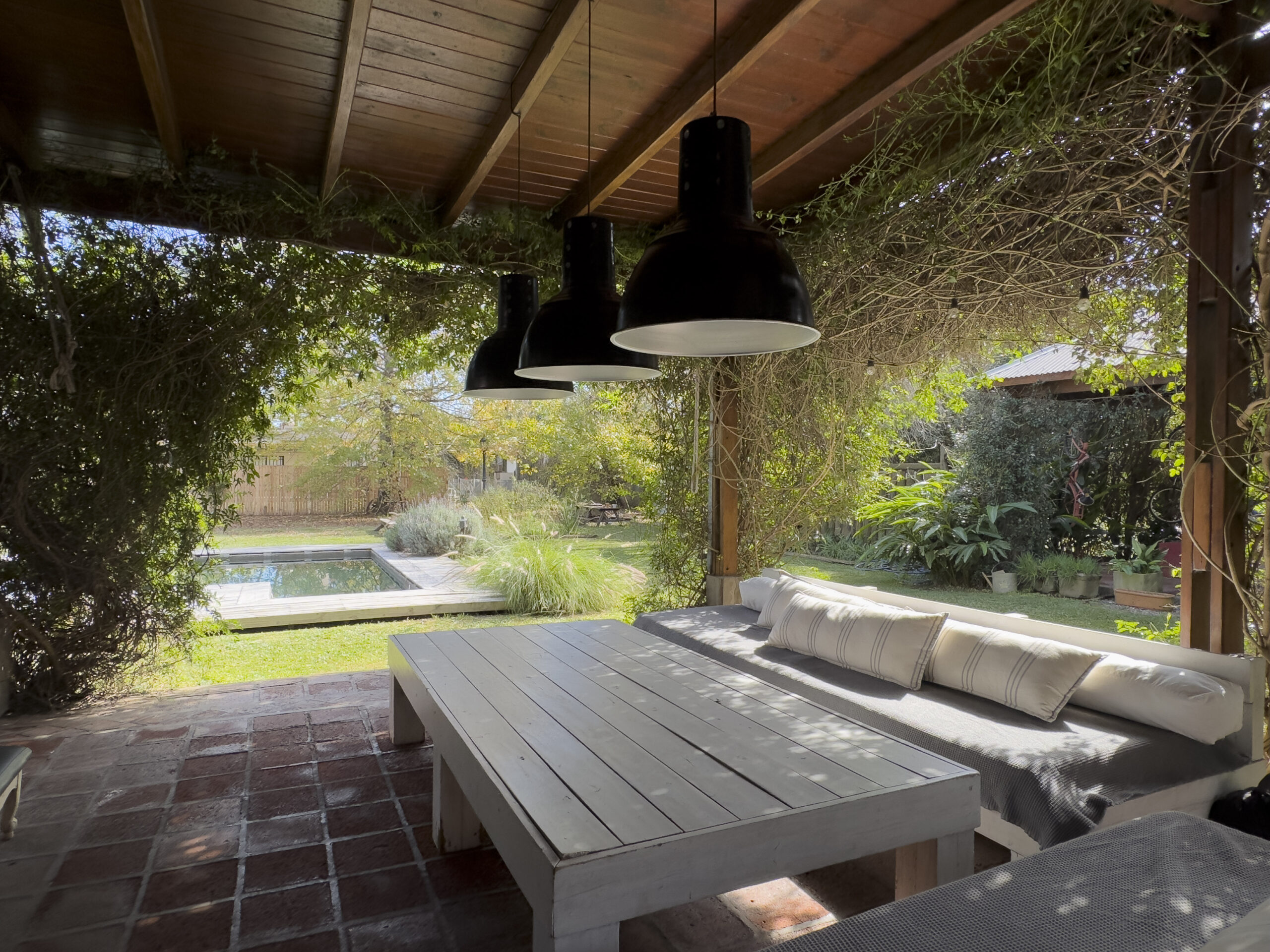 Gran jardín parquizado con piscina y árboles añejos .