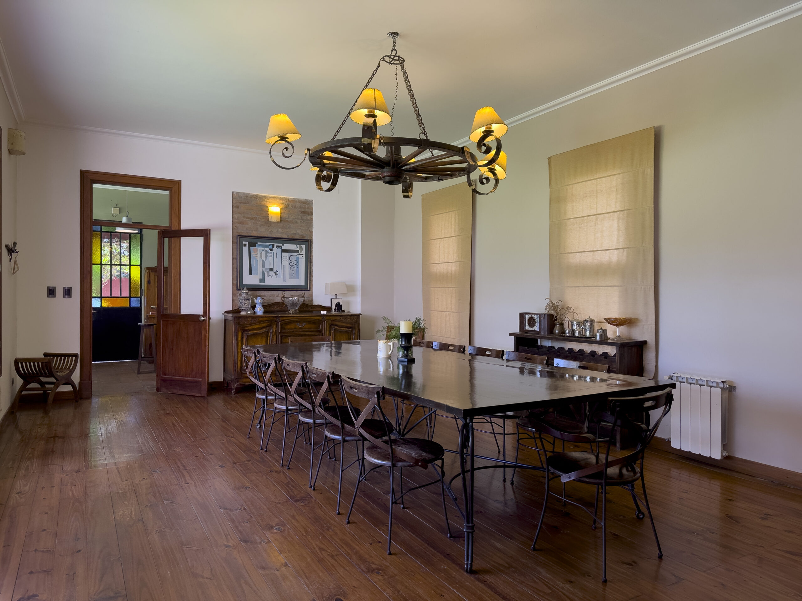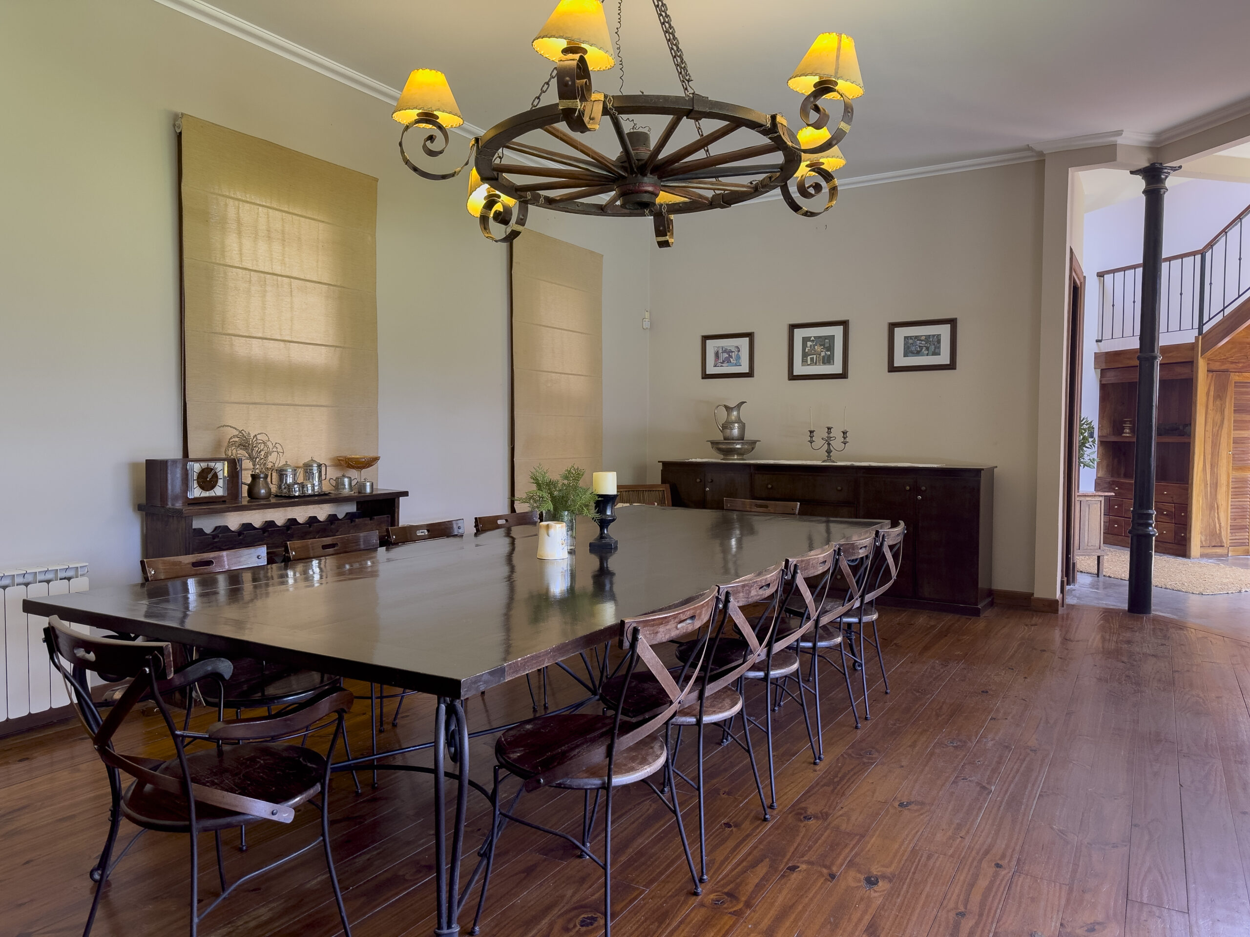 Gran comedor amueblado con mesa y sillas para 10 personas, ventanas al jardín y mueble vajillero.