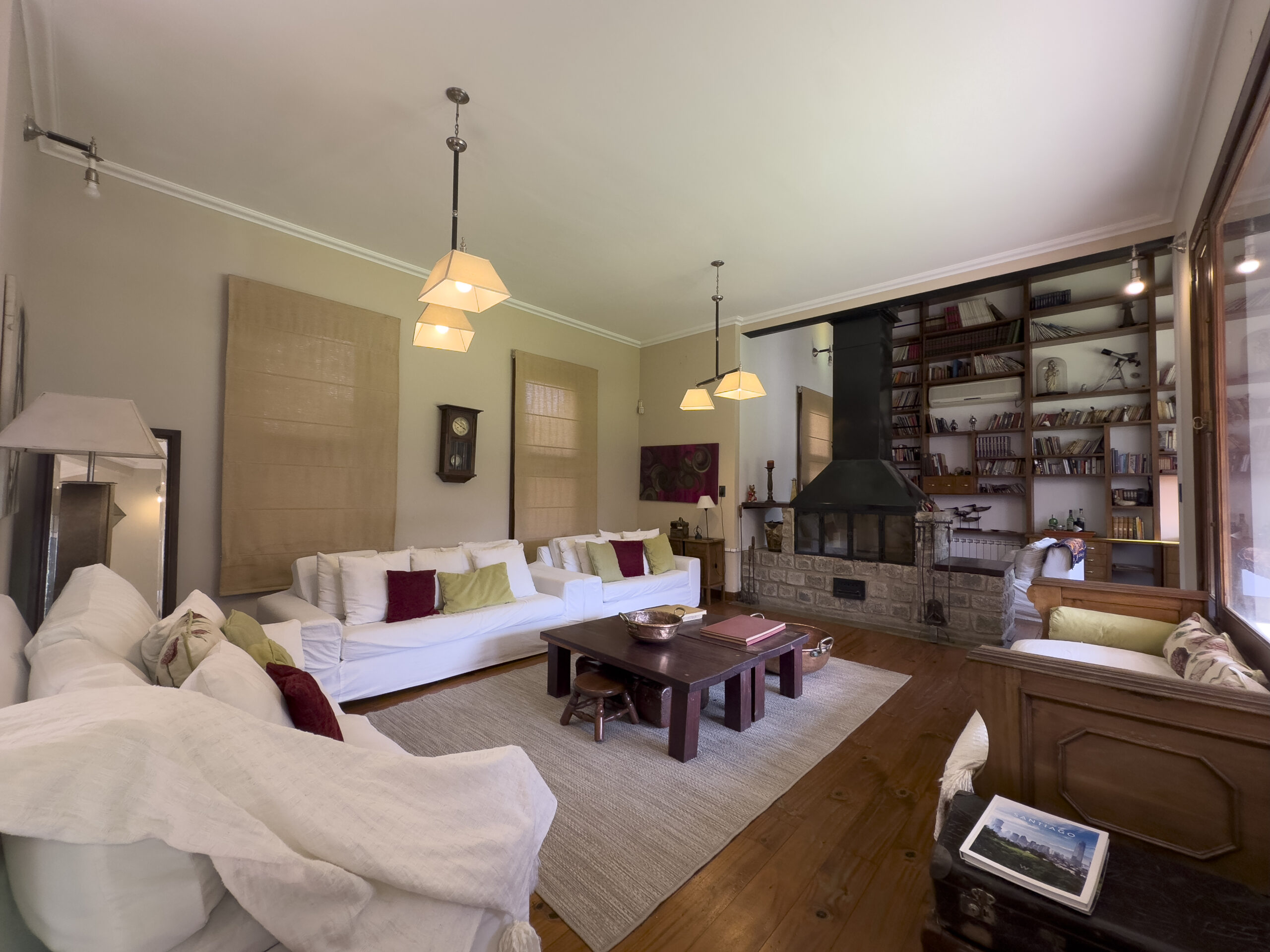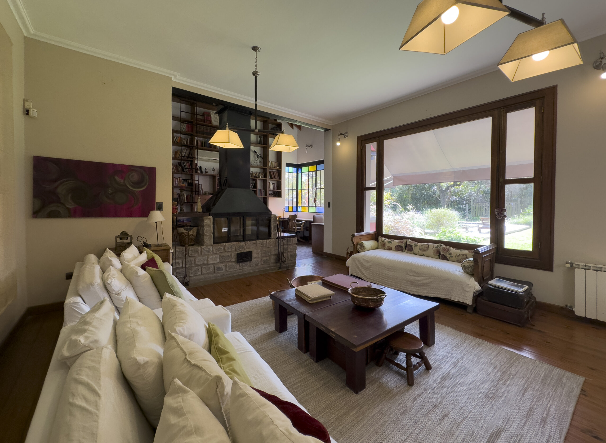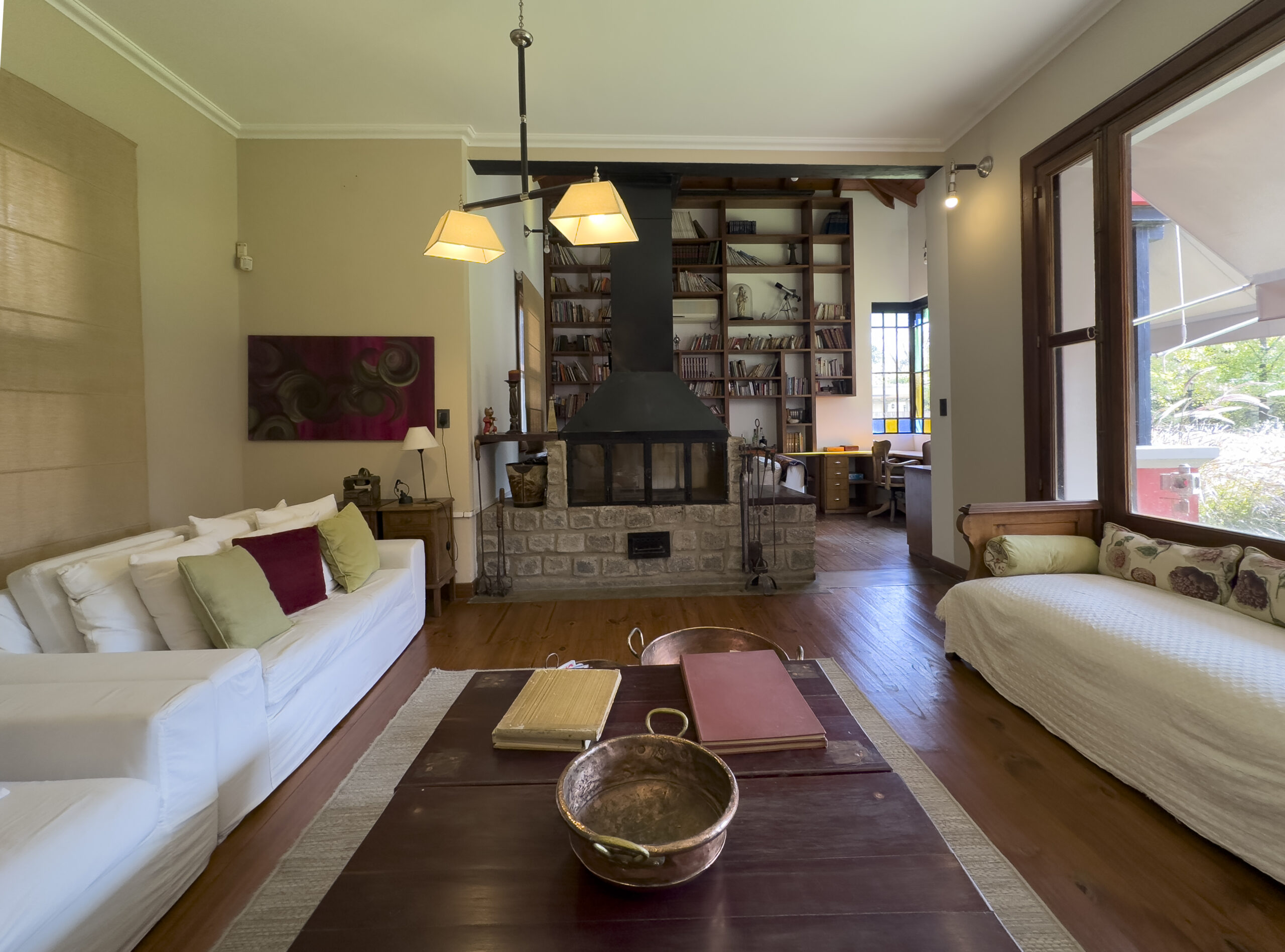 Living amplio con hogar a leña, provisto de sillones y mesa ratona. Biblioteca empotrada en la pared con escritorio.