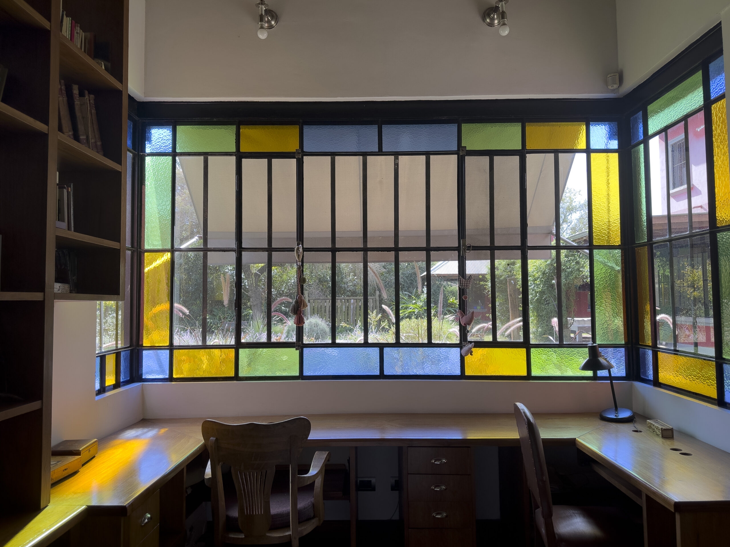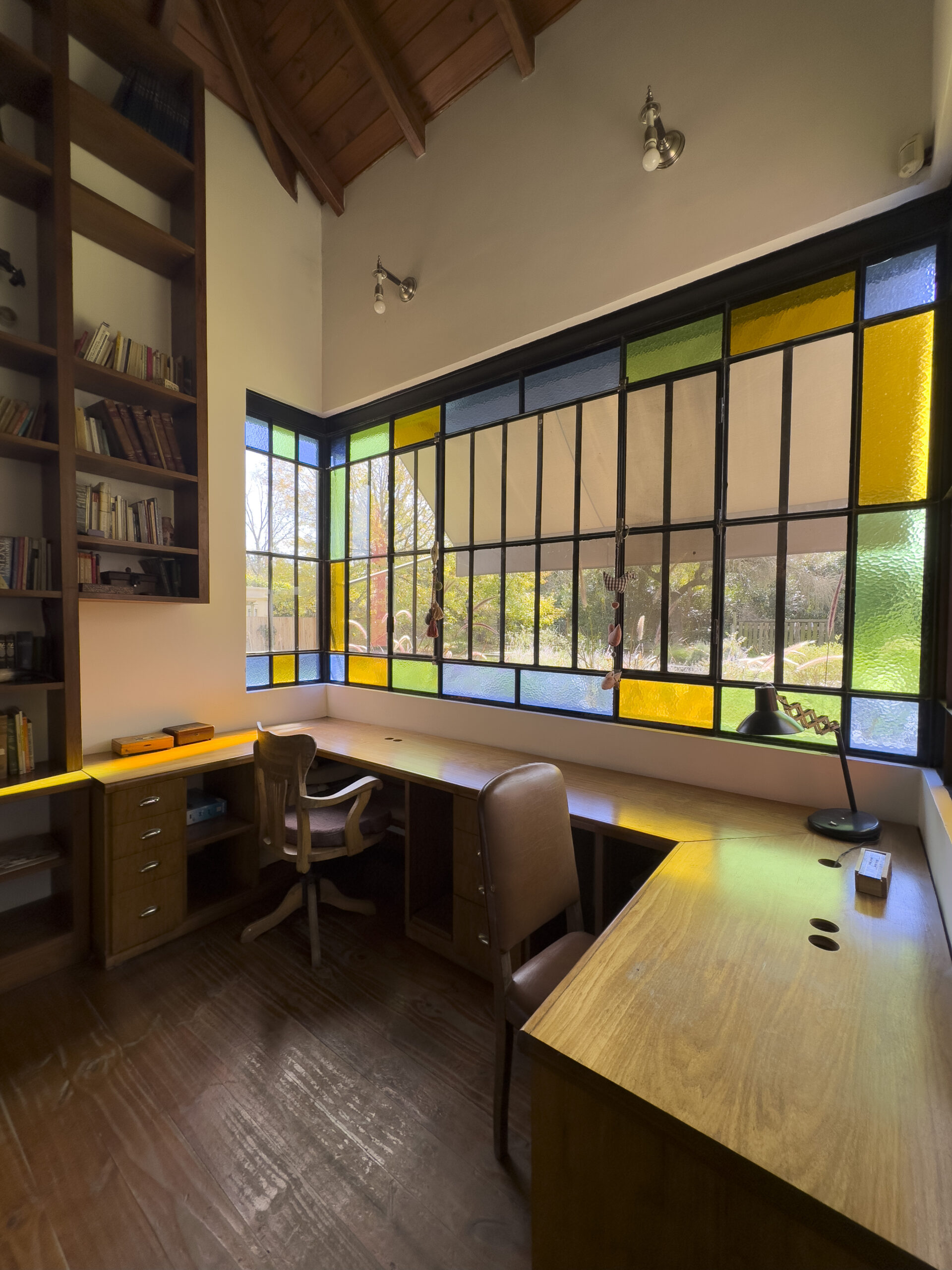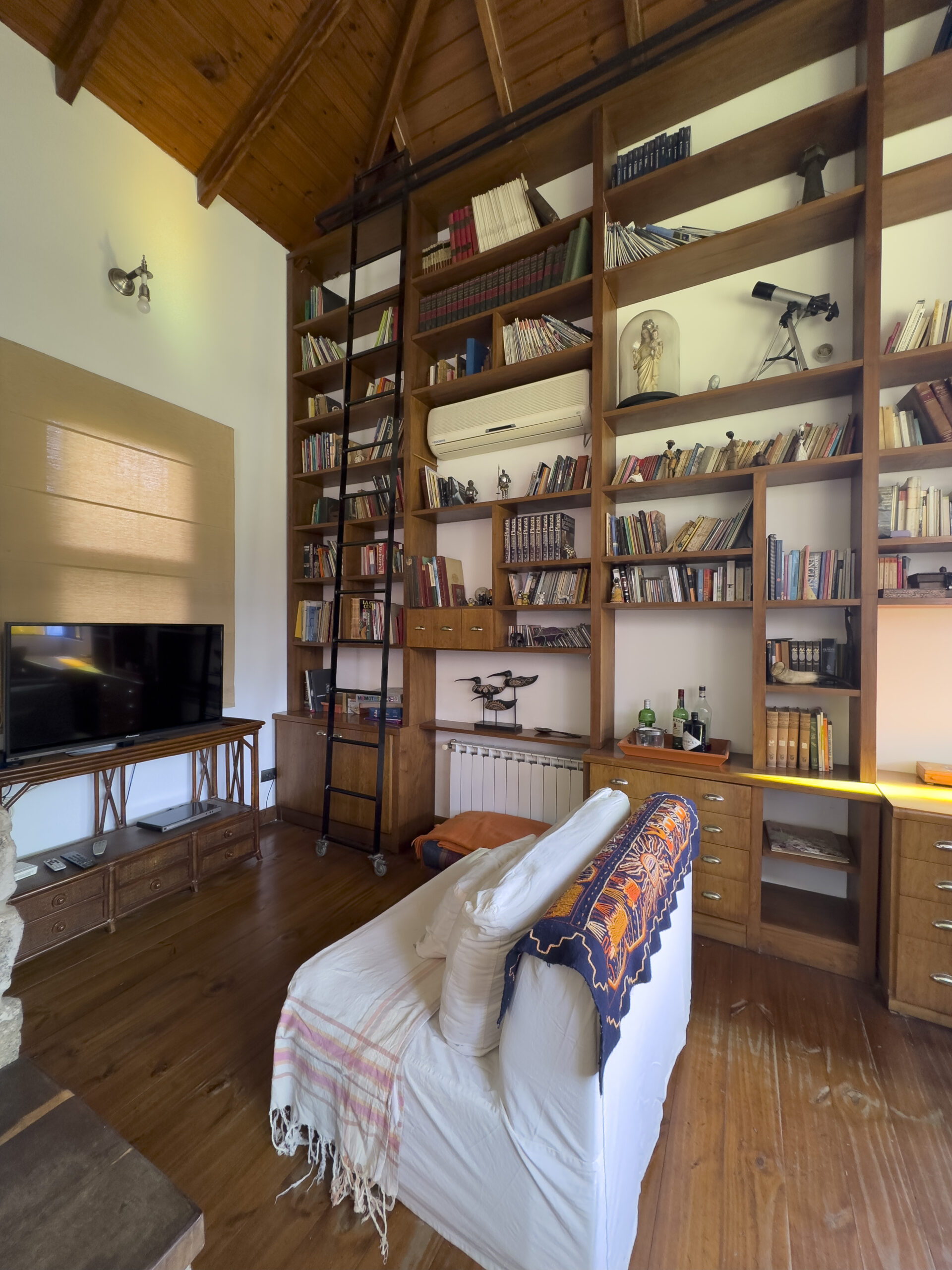 Living amplio con hogar a leña, provisto de sillones y mesa ratona. Biblioteca empotrada en la pared con escritorio.