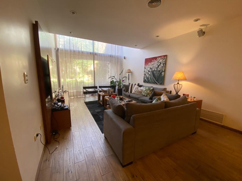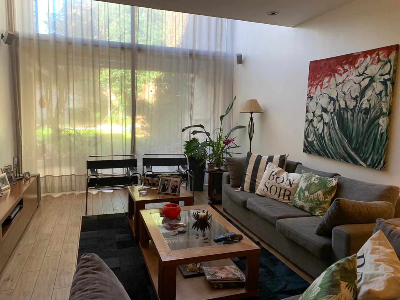 Living comedor amplio con doble altura, pisos de porcelanato italiano símil madera y puerta balcón con salida al exterior.