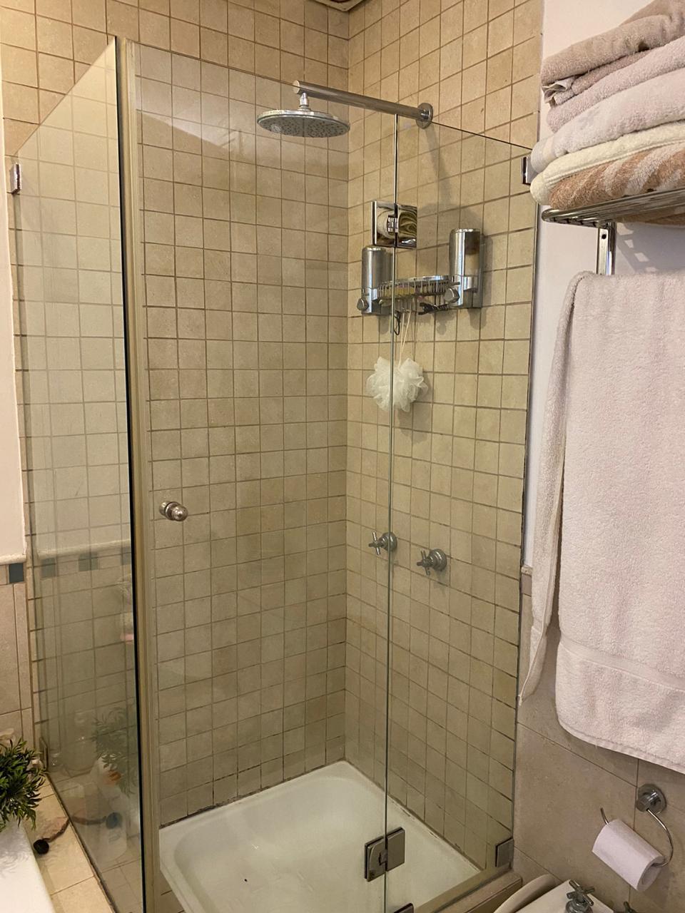 Baño completo con mueble bajo la mesada y receptáculo con mampara.