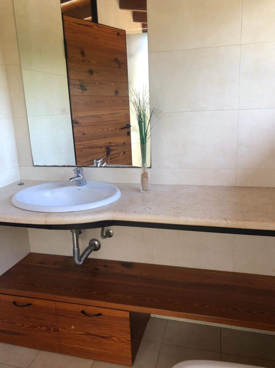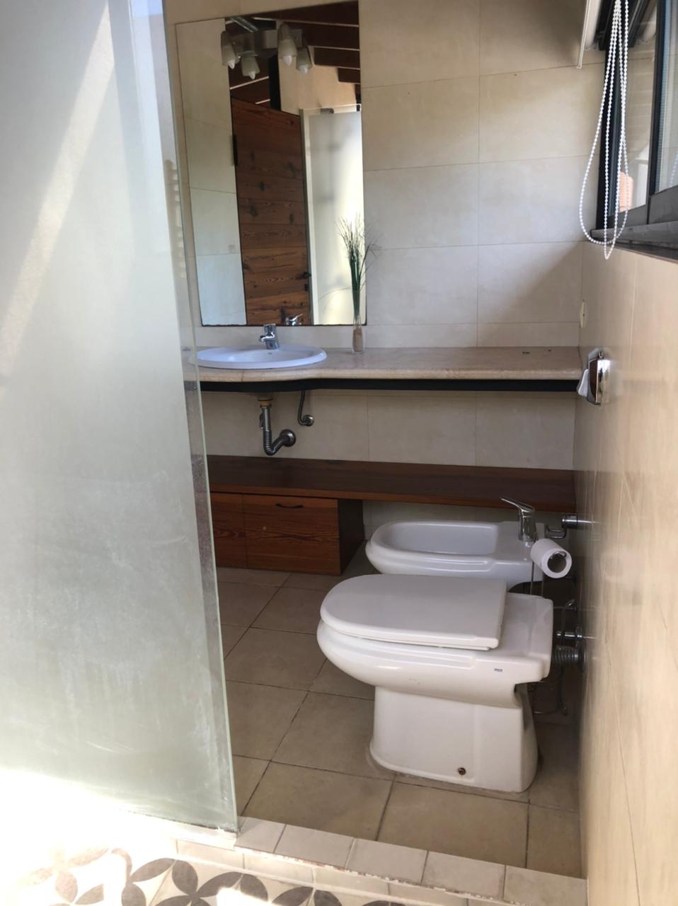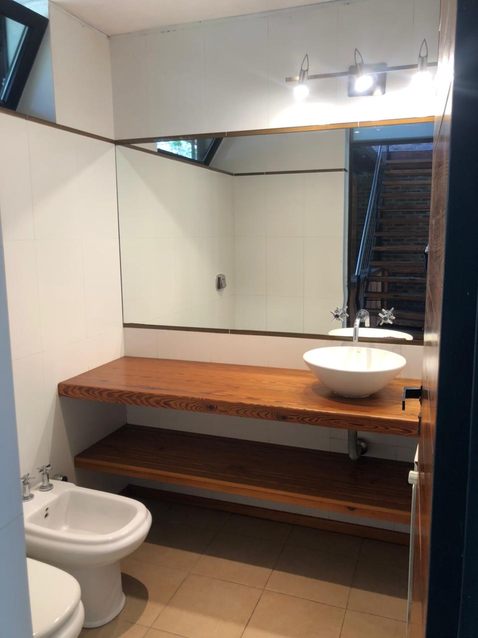 Baño de invitados con mesada de madera, bacha, inodoro y bidet.