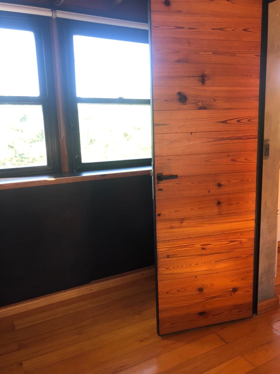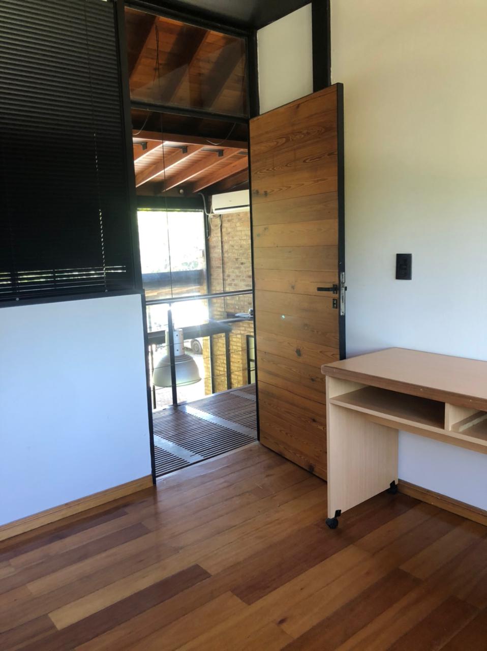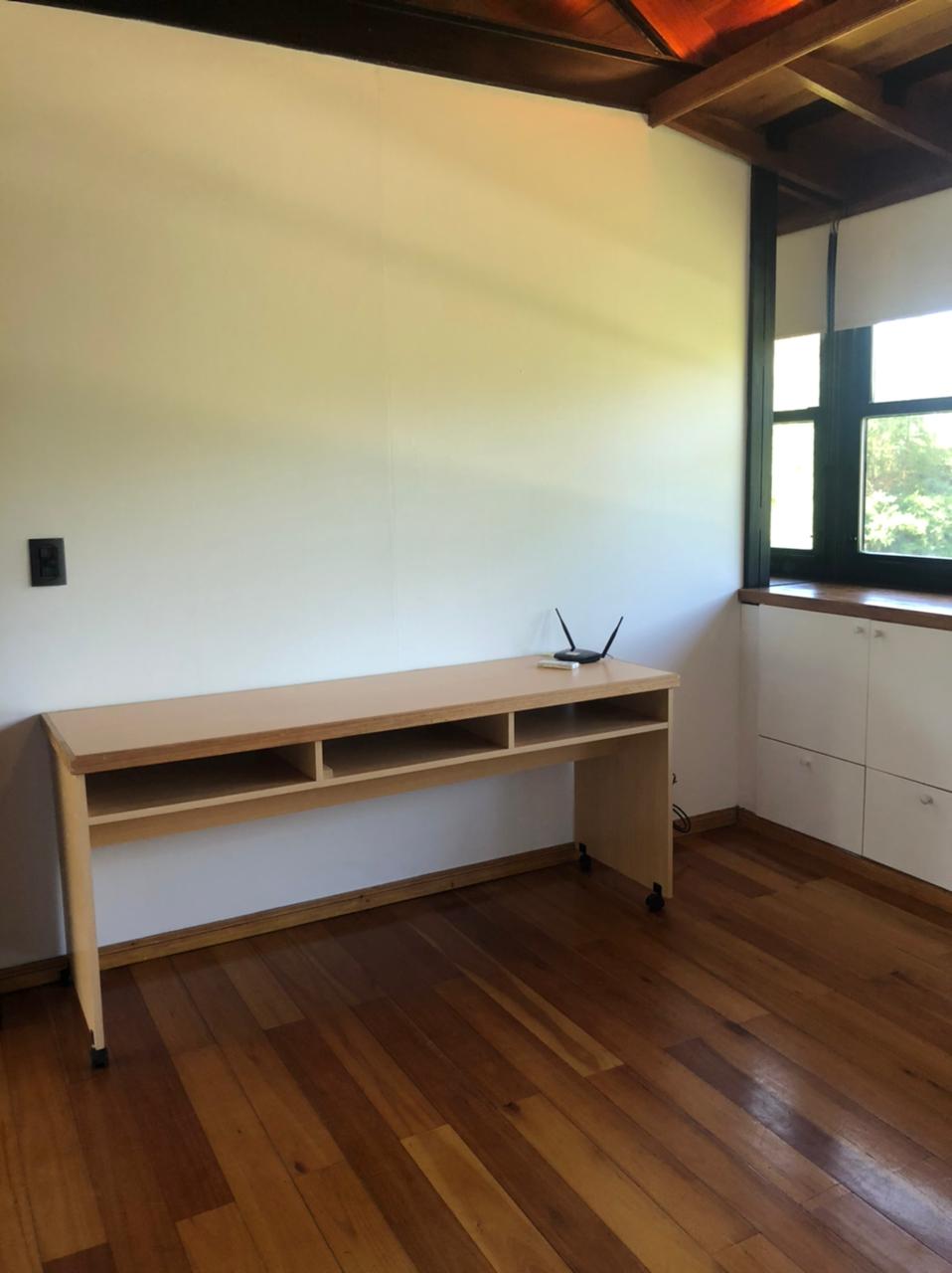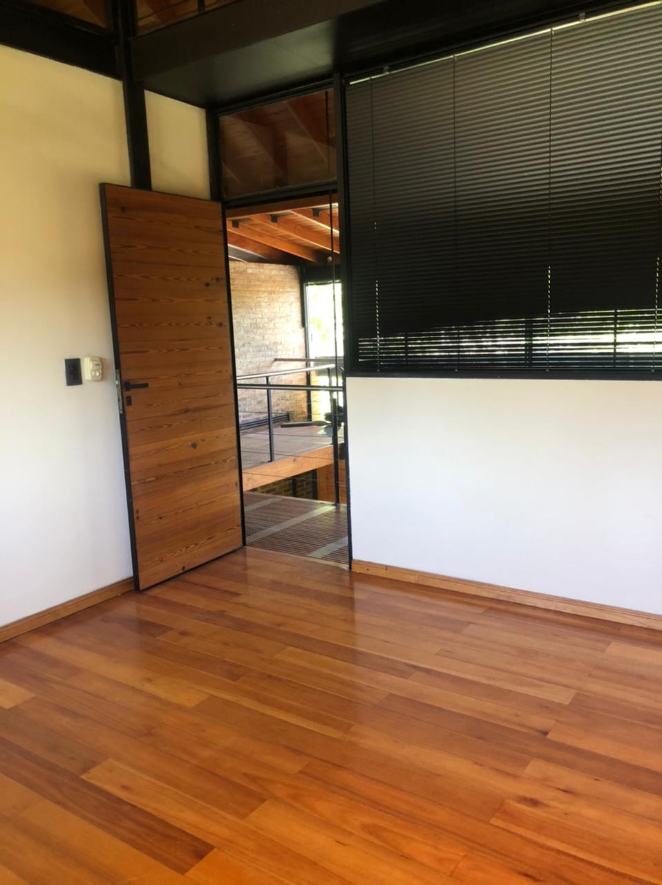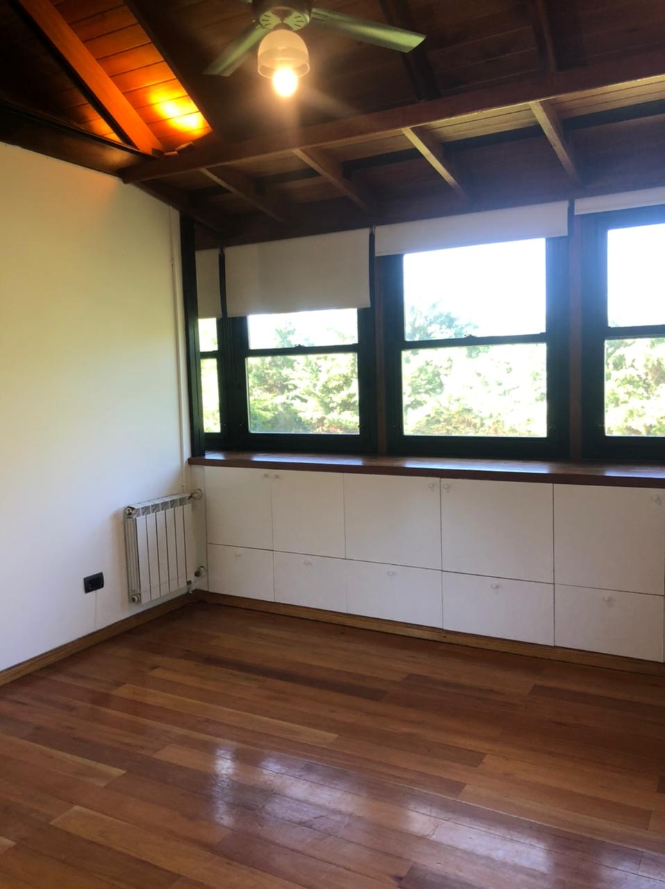 Tres dormitorios con muebles bajos tipo cajoneras, techos de madera y ventanas con vista al jardín. Vestidor con piso de madera y baño completo con hidromasaje doble.