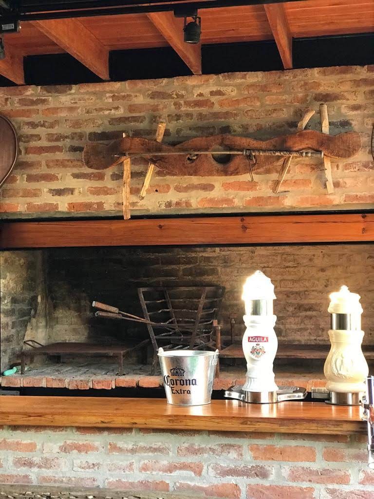 Galería cubierta con techos de madera, parrillero y cerramiento de lona.