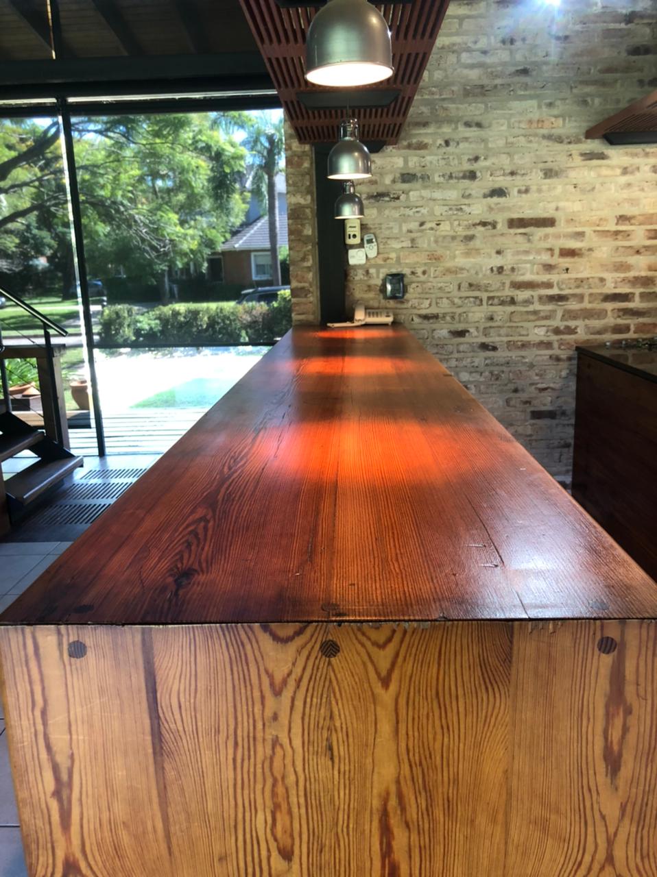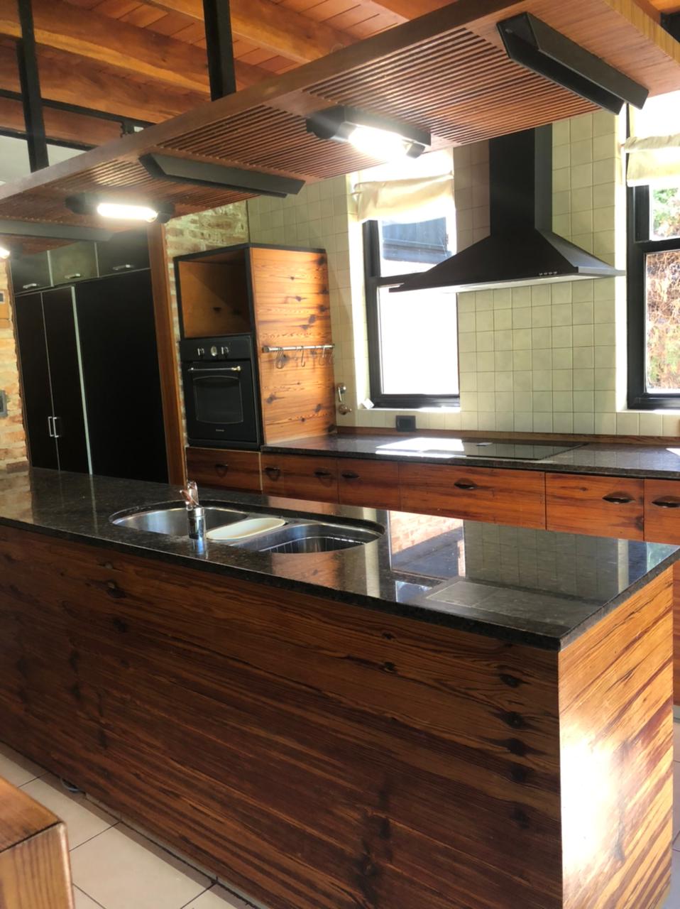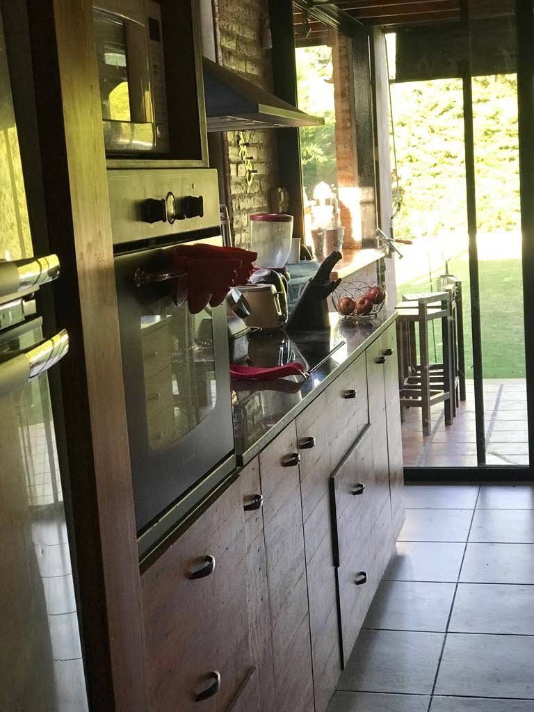 Cocina completa con alacena y bajomesada de madera, isla, anafe, horno, campana y lavavajillas.