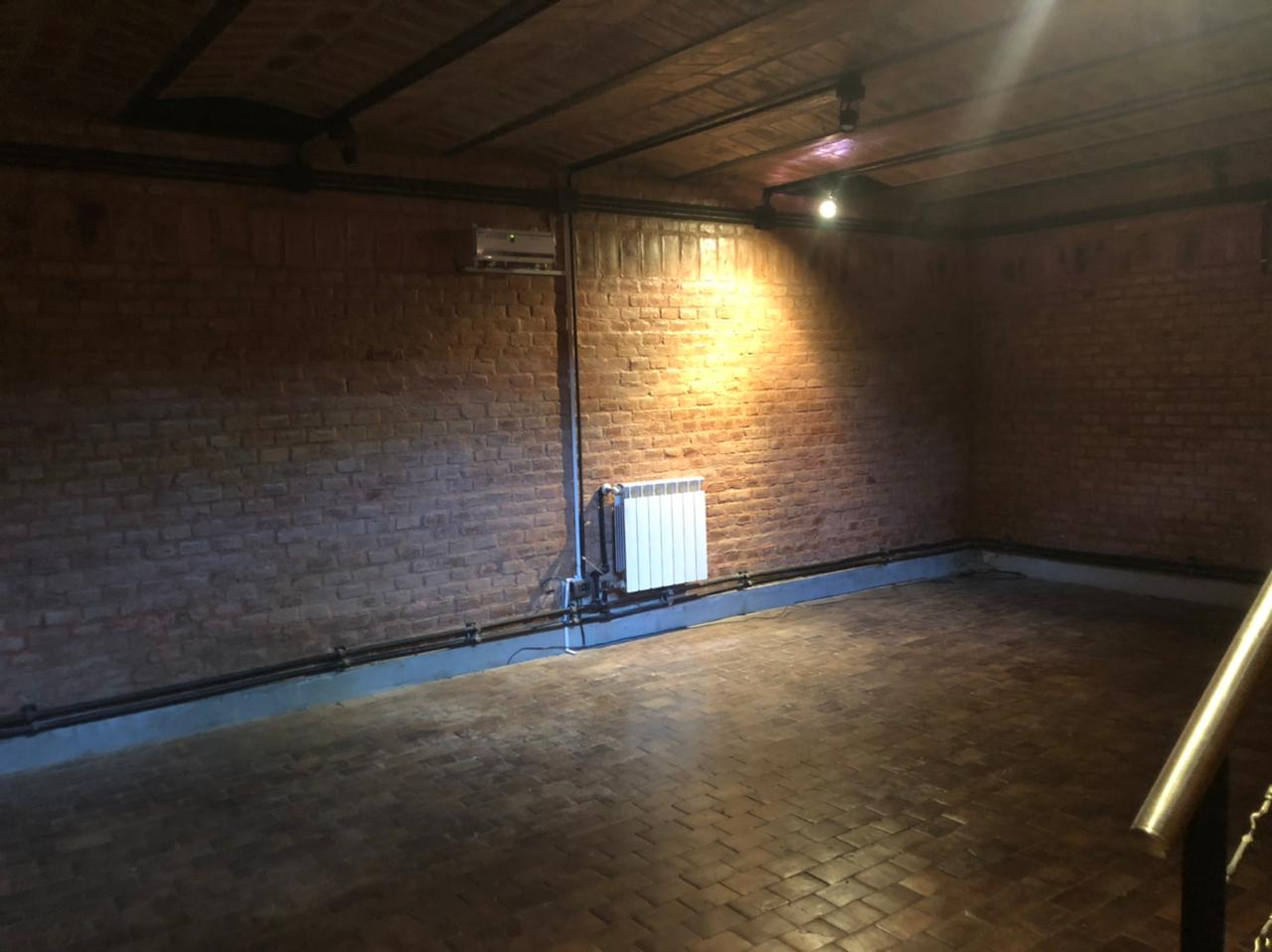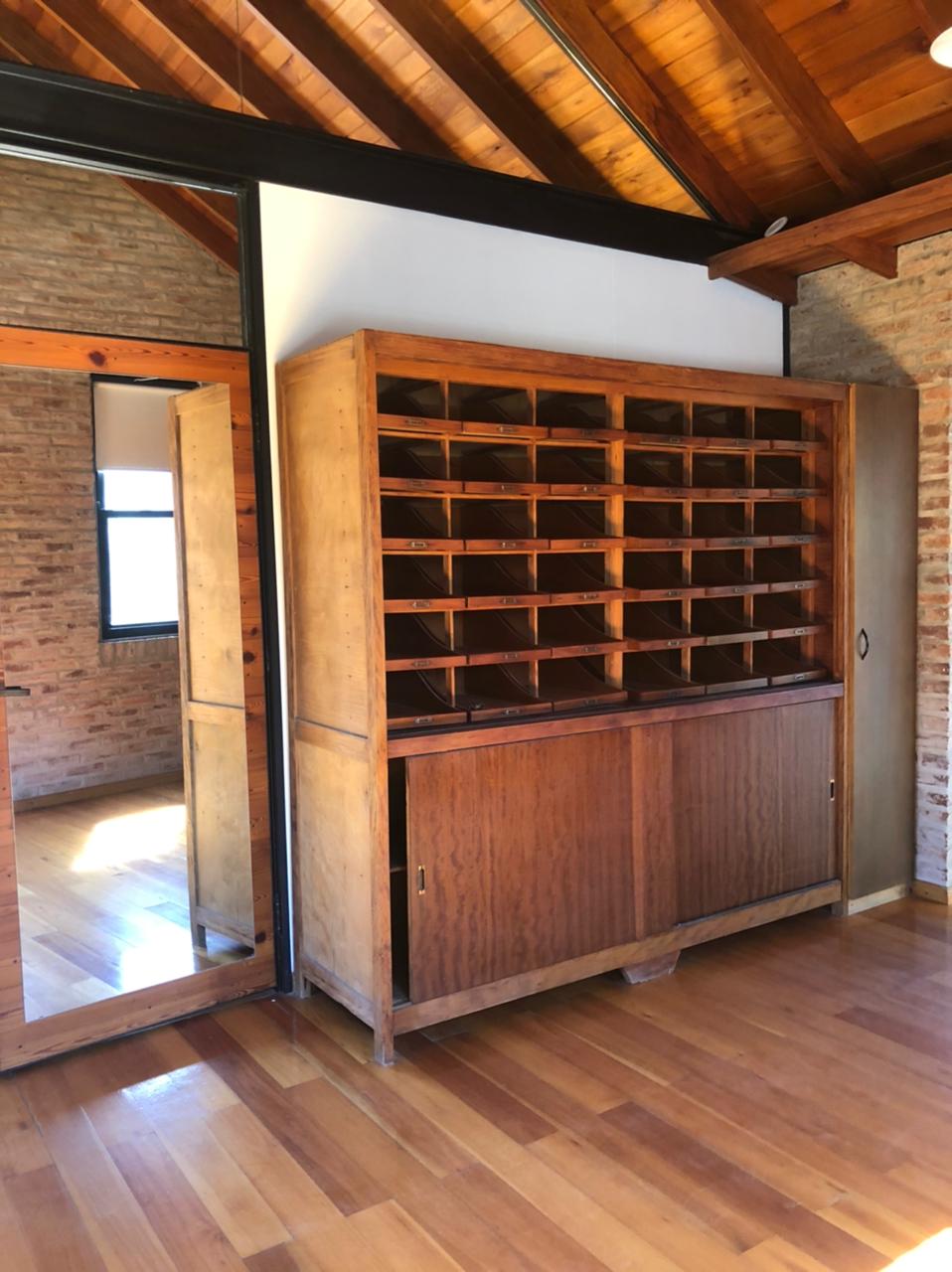 Comedor amplio con mueble bajo empotrado de madera, separado de la cocina a través de una barra divisoria y con puertas balcón que dan a la galería.