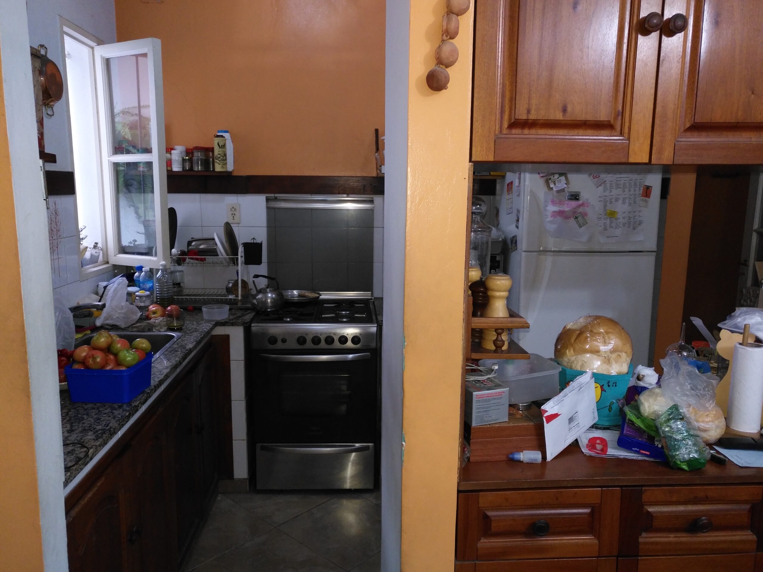 Living comedor integrado a la cocina con pasaplatos, mesada y bajo mesada. Despensa.
