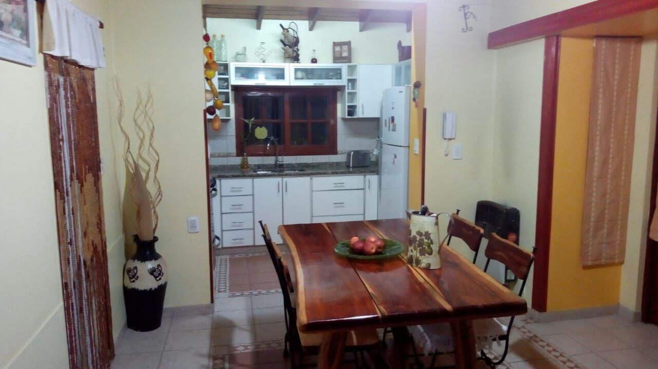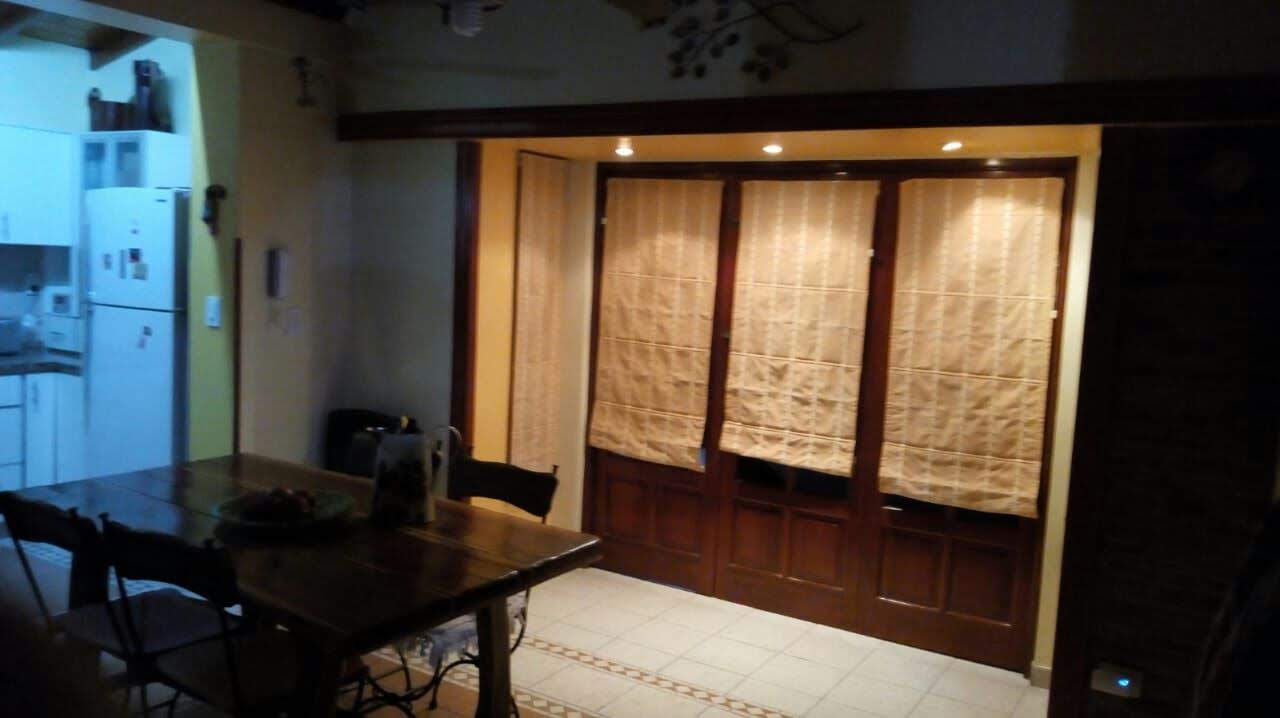 Comedor integrado a la cocina y conectado a la galería cubierta por gran puerta balcón de madera y vidrio.