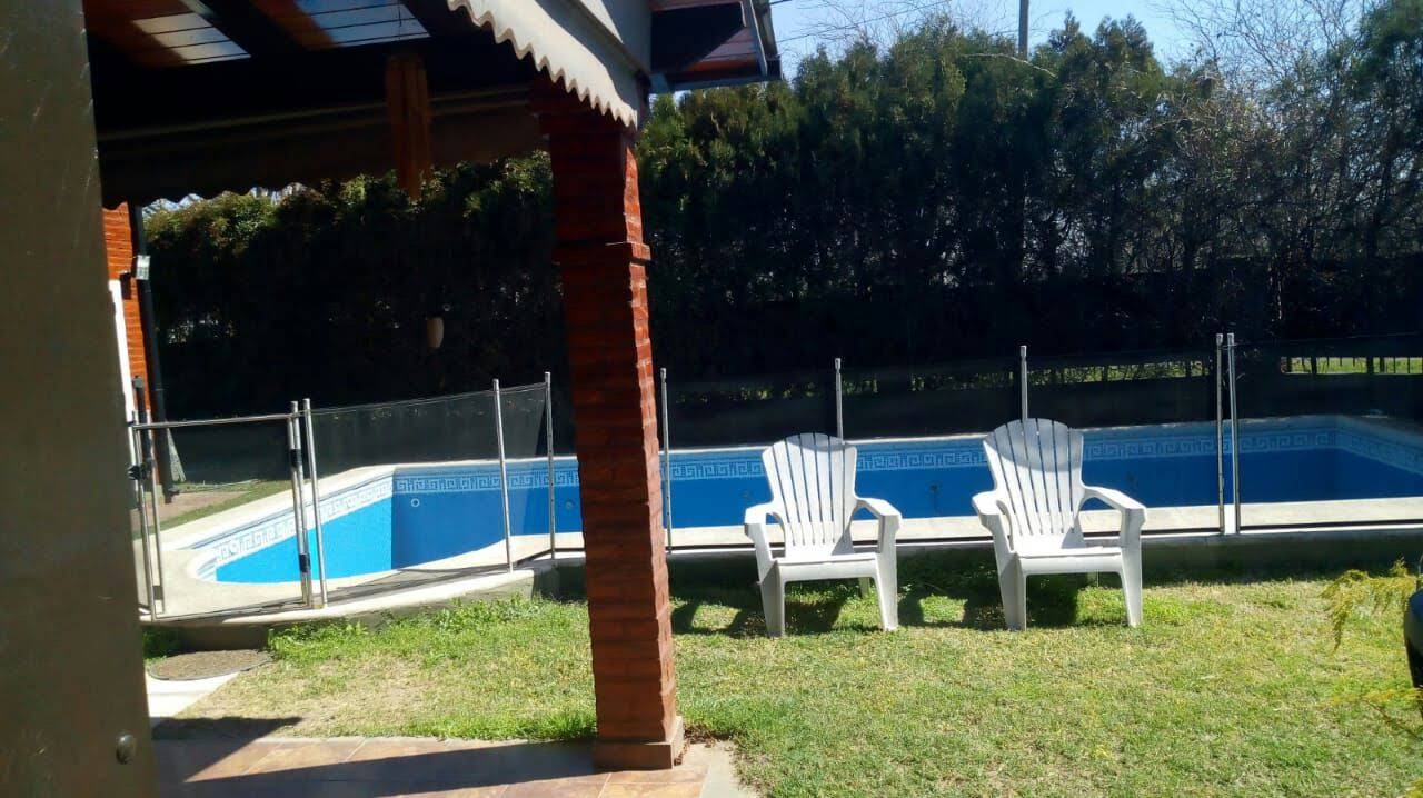 Gran quincho con ventanales de vidrio con vista al jardín y pileta.